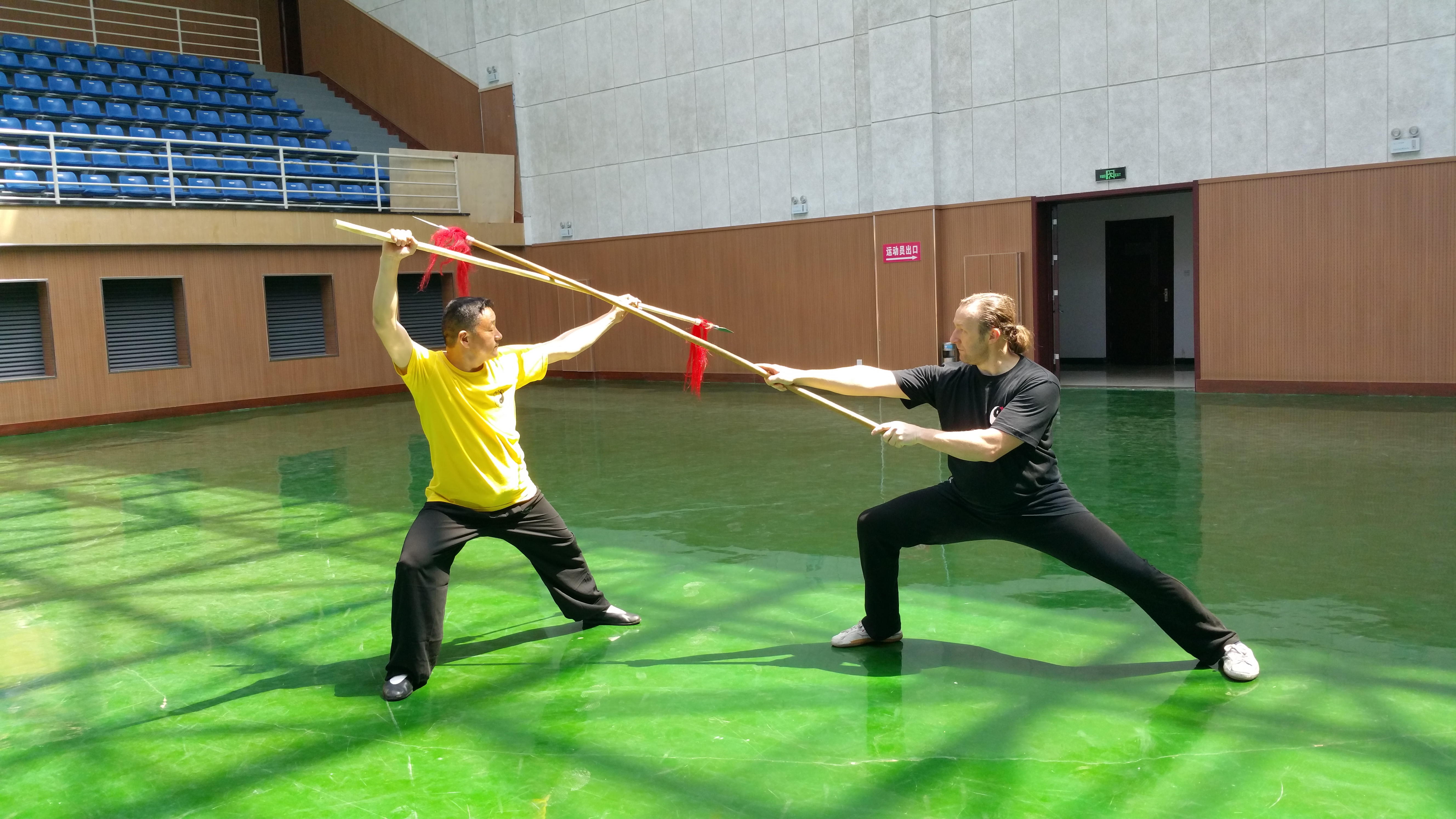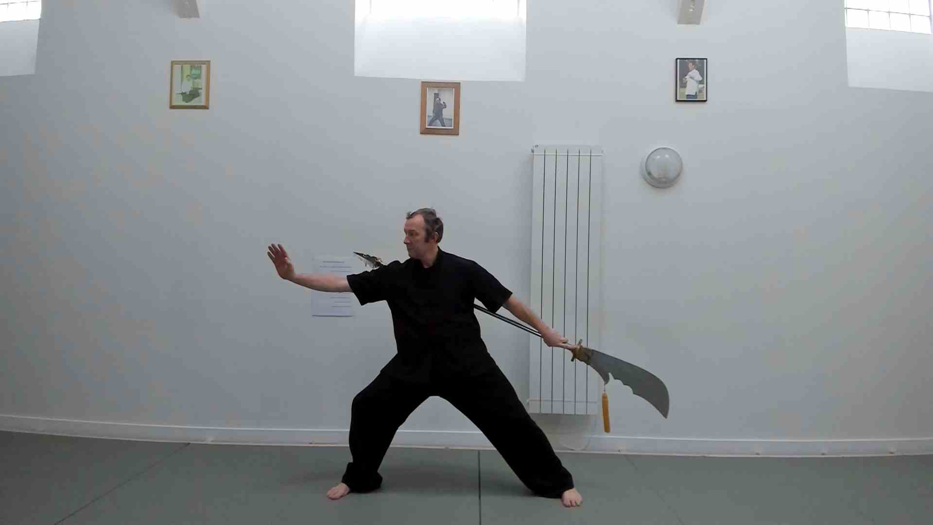 Armes du Taiji : L’étude du maniement en solo des armes courtes (sabres et épées) et des armes longues (lances et hallebardes) diffère grandement des formes à mains nues. Les armes ont une destination, une cible et tout le monde n’est pas au point sur certaines dimensions de cet objet. Nous n’abordons pas les armes à la légère, il recouvre de trop de subtilités pour passer à coté des éclairages qu’apportent ces outils. c’est un « vocabulaire » corporel encore différent qui viendra alimenter l’exercice des formes à mains nues