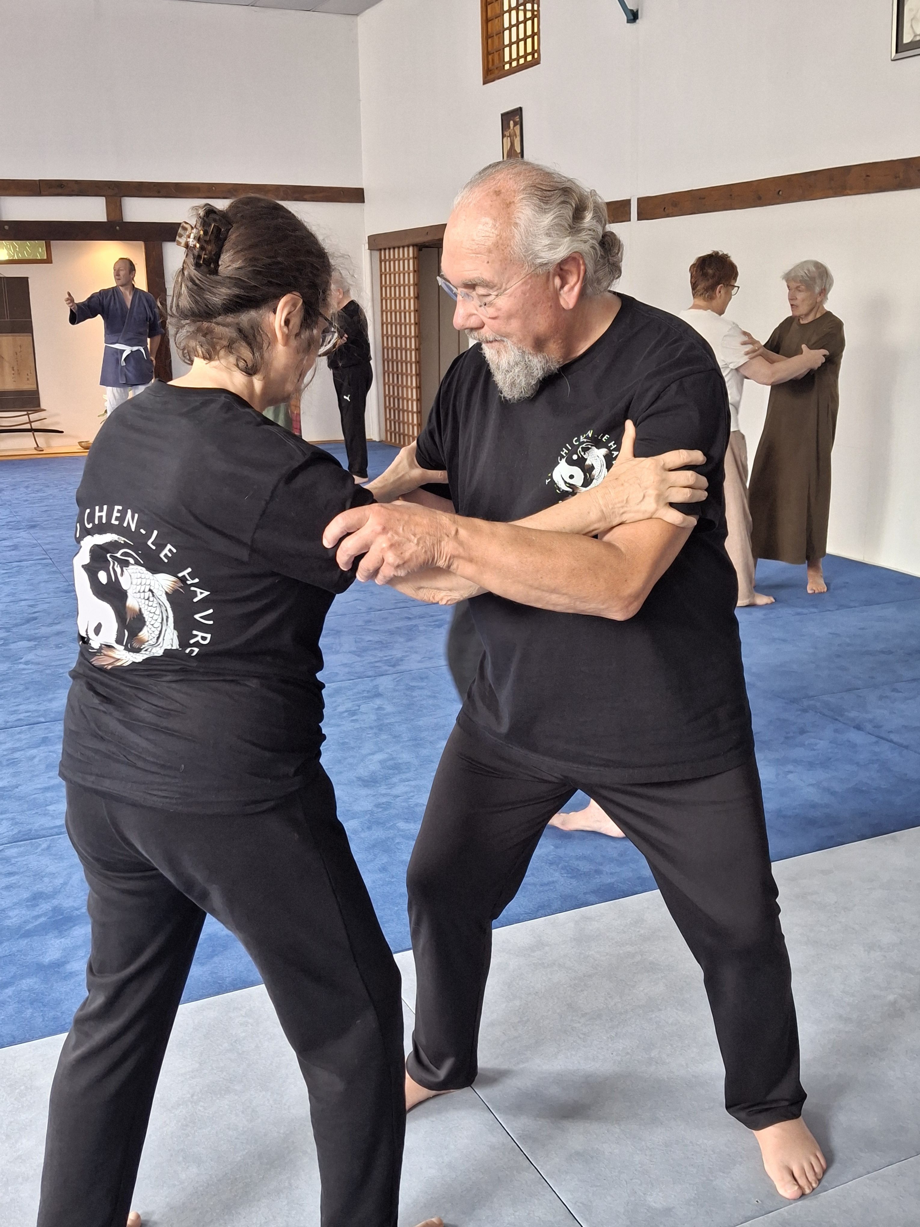 La pratique au dôjo s’organise par groupe d’une douzaine de personnes. la transmission se fait avec tous, avec les anciens, par les compréhensions du vaste sujet qu’est le tai ji !